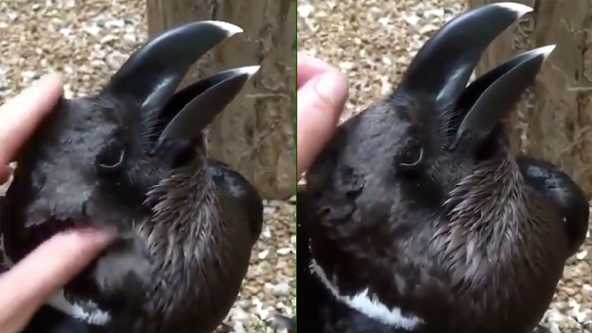 While Twitter seemed to be pretty split over if it was a rabbit or a bird, there is an answer: it's a white-necked raven that the man is petting.